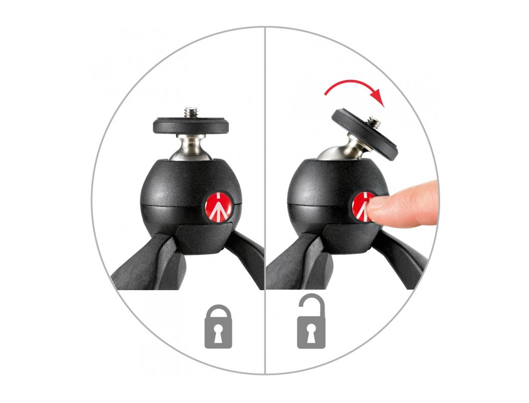 Штатив Manfrotto MTPIXI черный – это мини-опора для небольших фотокамер с предельной нагрузкой не более одного килограмма. Алюминиевая конструкция с покрытием soft touch обеспечивает комфорт в эксплуатации. С помощью горизонтального колеса камера легко вкручивается в стандартный резьбовой адаптер 1/4 дюйма, к которому можно присоединить сменную площадку переходник (в комплект не входит) для смартфона. А поворотный механизм шаровой головки активируется одним нажатием кнопки с логотипным рисунком. Несмотря на миниатюрный размер и вес всего 190 грамм, тренога очень прочная и выдержит даже небольшую видеокамеру на максимальной высоте не более 18.5 см. Изделие выполнено в черном цвете с серой надписью логотипа и классической для продукции Manfrotto красной фиксирующей кнопкой. Упакован трипод в картонно-пластиковый блистер с подробной инструкцией в комплекте. Продукт находится в средней ценовой категории для продукции премиум-класса и доступен большинству фотолюбителей качественных аксессуаров для своей работы.